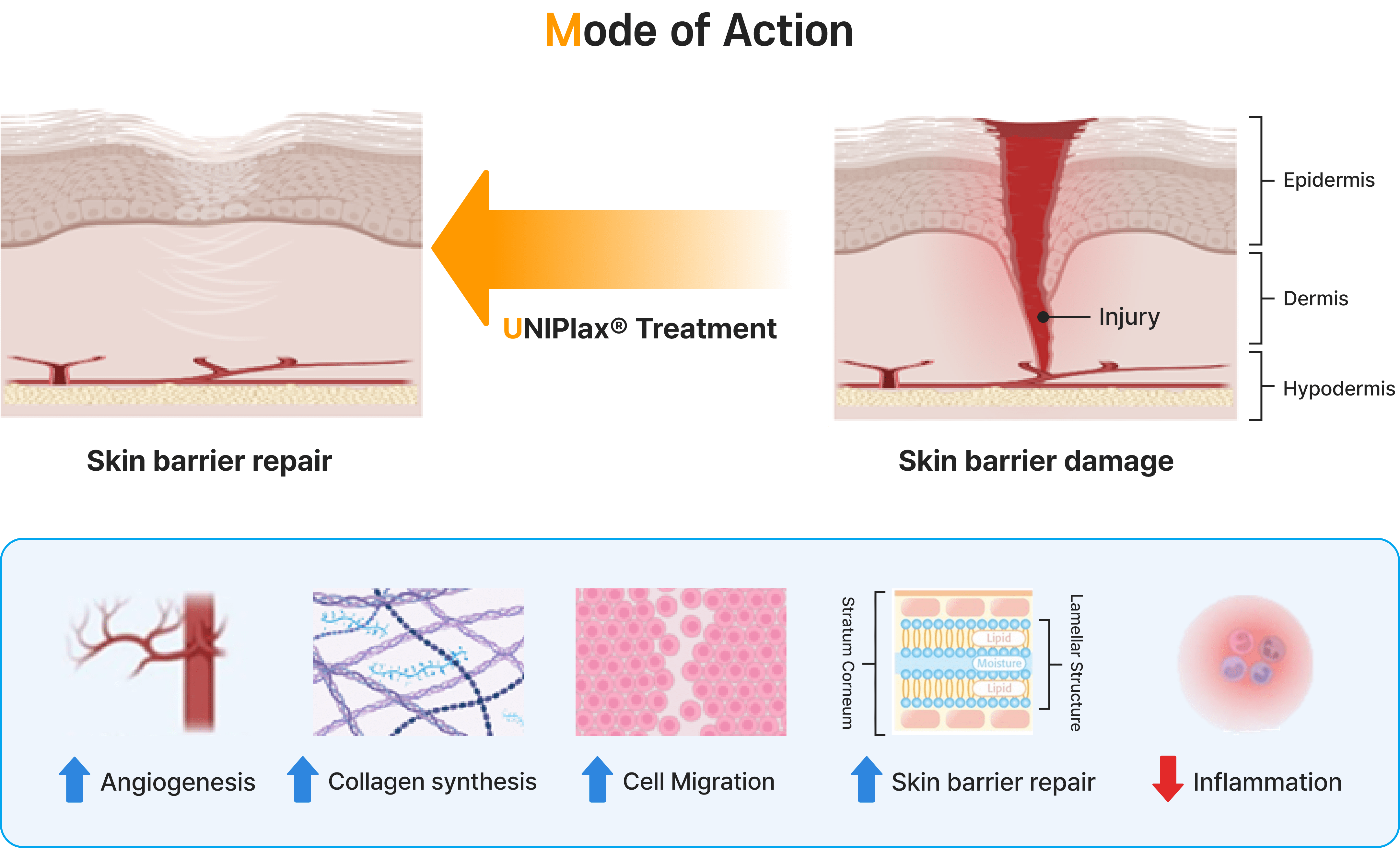 - 혈관 신생, 콜라겐 합성, 세포 이동 및 피부 장벽 복구를 지원